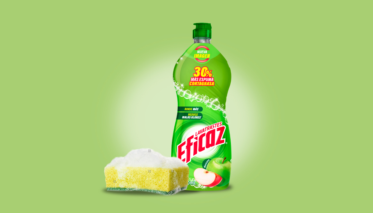 En un recipiente usa una cucharada (10 mL) de Eficaz en 500 mL de agua tibia, sumerge tu esponja y oprímela varias veces para formar espuma y comienza a limpiar.